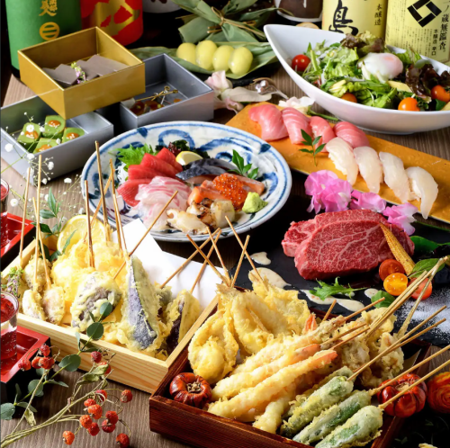 오뎅, 튀김, 극상 소 등심 스테이크와 사시미 등을 맛볼 수있는 다양한 코스를 준비하고 있습니다.음료 무제한입니다.※전날까지 예약을 부탁드립니다.점심 연회, 환영합니다.